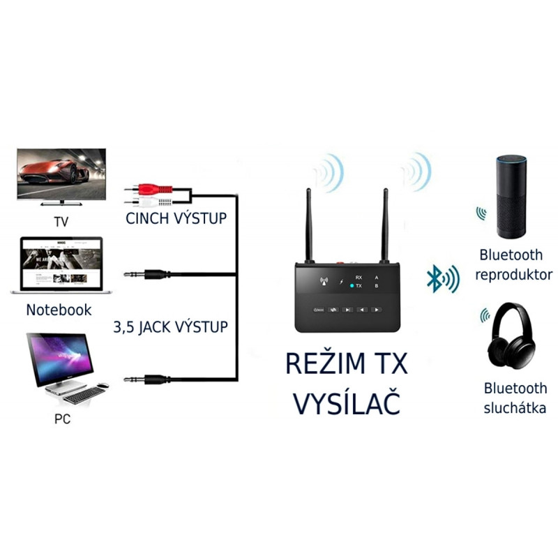 Bluetooth adaptér EVERCON RX TX slouží k přenosu zvuku na vzdálenost až 50 metrů . Adaptér dokáže být buď vysílačem nebo přijímačem