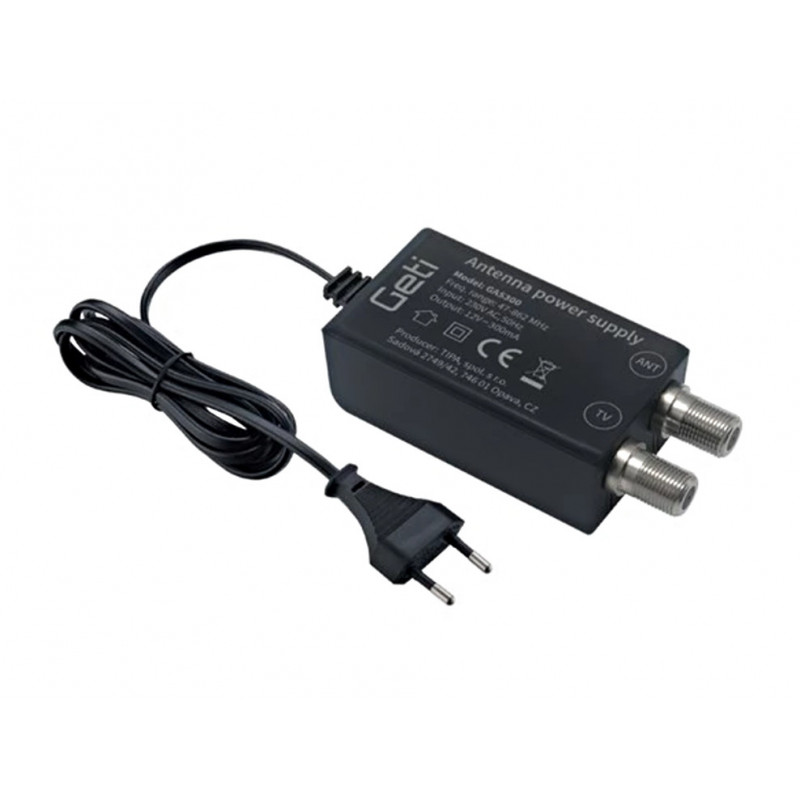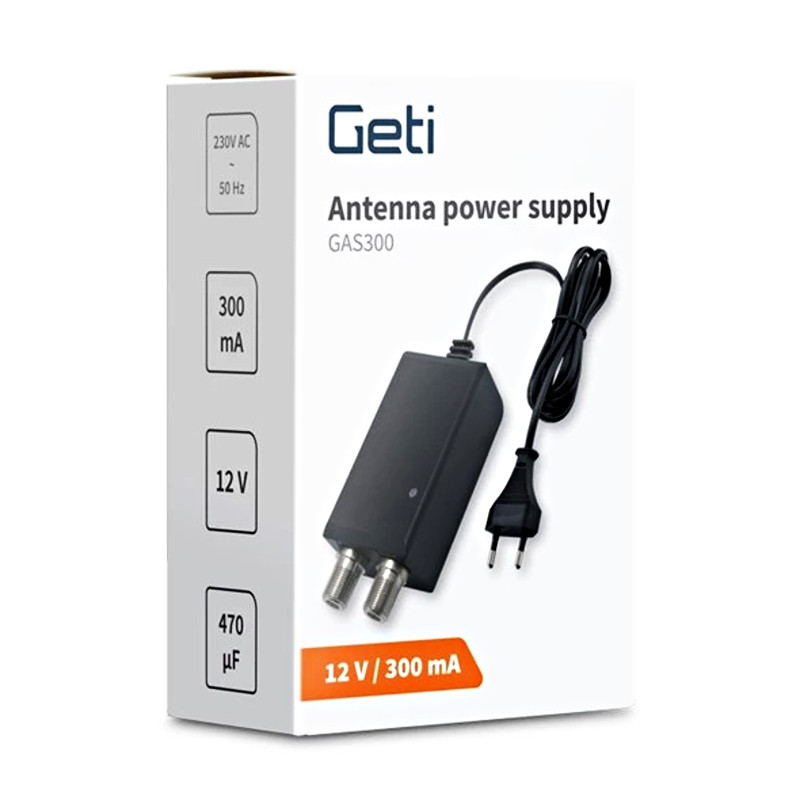 Anténní napájecí zdroj GETI GAS300 je určen k napájení anténních předzesilovačů, zesilovačů a aktivních rozbočovačů v malých anténních systémech vyžadujících 12 V stejnosměrného napětí. Je vybaven zásuvkami pro připojení F konektorů, což značně urychluje a usnadňuje montáž koaxiálního kabelu. LED dioda indikuje přítomnost výstupního napětí a správnou funkci napájecího zdroje.